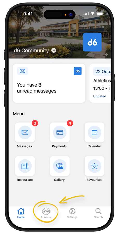 Open your d6 Communicator App and look for the AI Assist feature at the bottom of the screen. If your school has enabled it, you are already set up.